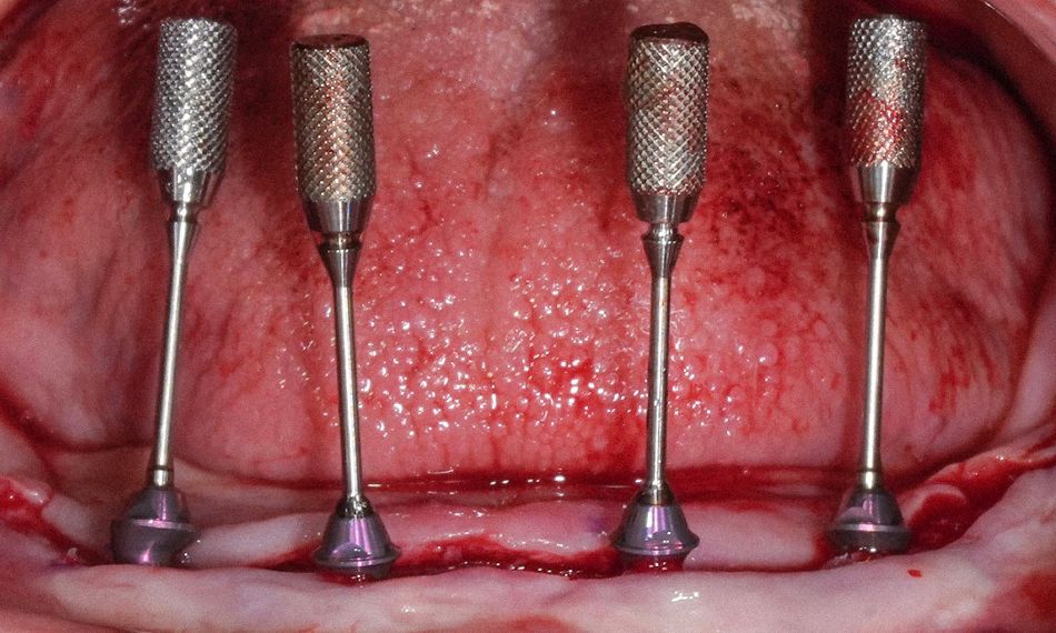 Step 4: In the lower jaw, implants were placed using a freehand technique: two tilted and two axial implants.
