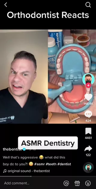 When you see a dental practice or colleague posting stellar content on TikTok, you can Duet it and share it with your followers. You can also make funny Duets like the one below: a reaction to an ASMR artist’s dental parody.