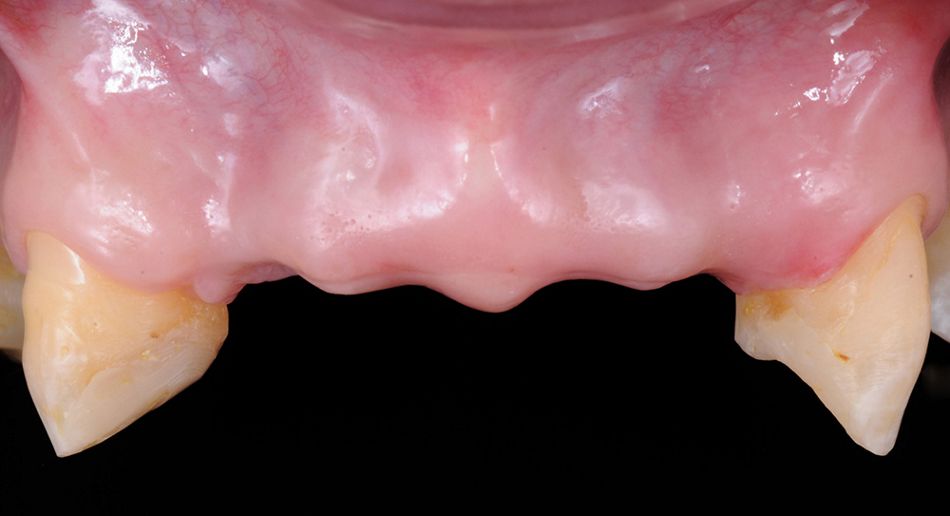 The clinical examination showed a significant horizontal deficiency of the anterior(Figs. 1, 2). Panorex Rx (Fig. 3). Study models mounted on a semi-adjustable articulator were taken and a diagnostic wax-up of the four incisors was made with a modeled gingiva (Fig. 4) to provide an idea of the amount of tissue to be regenerated. In the axial slices and the 3D reformatted CT images, the lack of bone in the horizontal and vertical dimensions could be evaluated precisely. A stepwise surgical approach was planned: in a first step, a GBR procedure would be performed. In a second step, two submerged implants should be inserted and, if necessary, an additional GBR procedure performed. In a third step, implants should be uncovered together with a soft tissue augmentation. The initiation of the prosthetic phase was planned 30 days after the implant activation surgery.