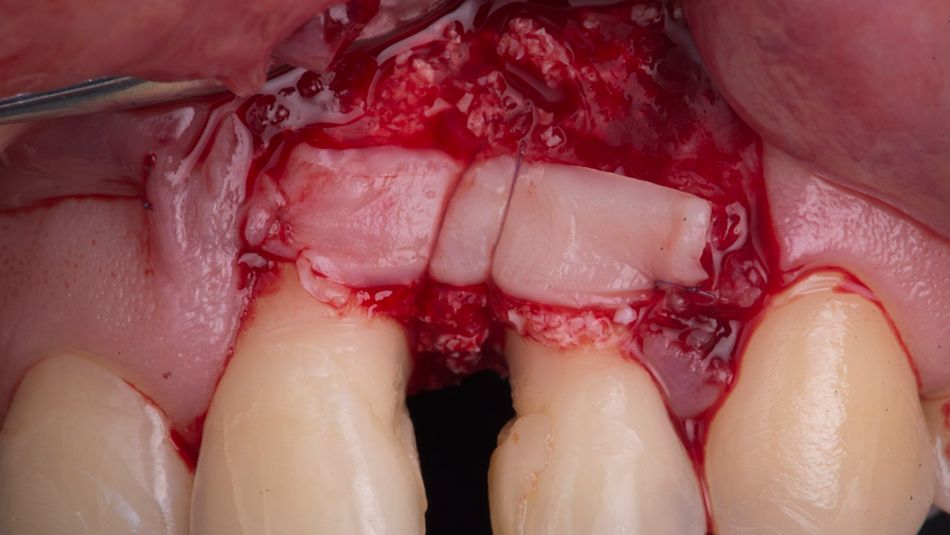 Periodontal reconstructive surgery at teeth #21 and #22: CTG wall technique using Straumann® Emdogain® and Straumann® XenoGraft.