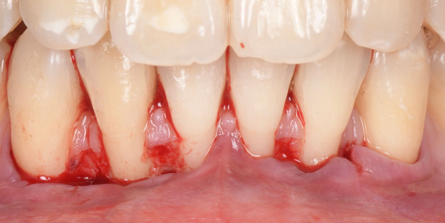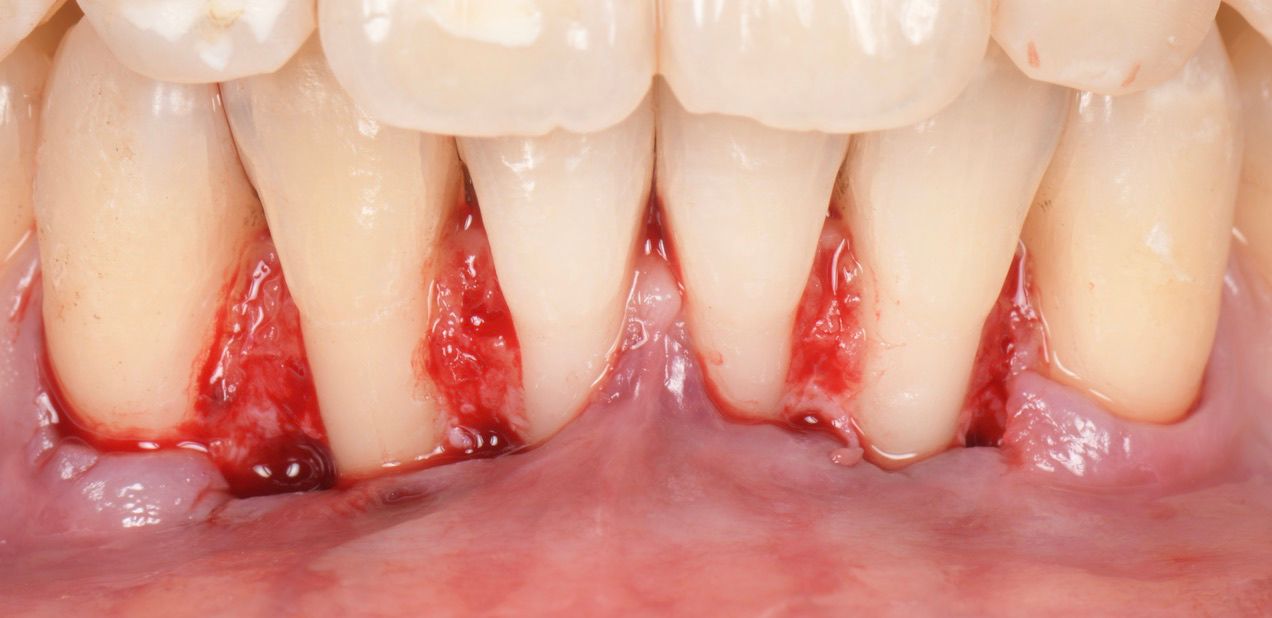Two split-full-split flaps were raised from teeth #33 to #31 and #41 to #43, with beveled incisions at the base of the papilla (Fig. 3).