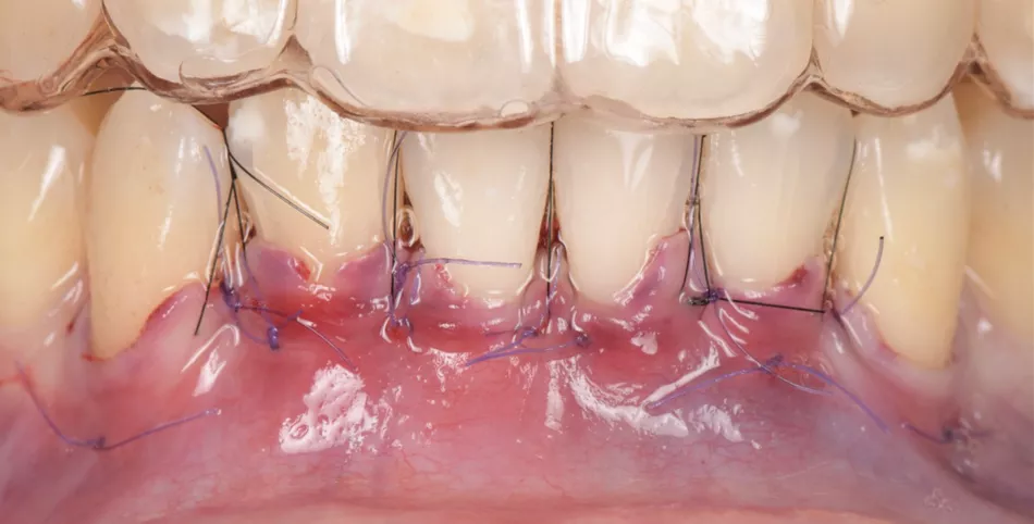 - Periodontal reconstructive surgical treatment: Coronally advanced flap with two autologous connective tissue grafts and Straumann® Emdogain®.