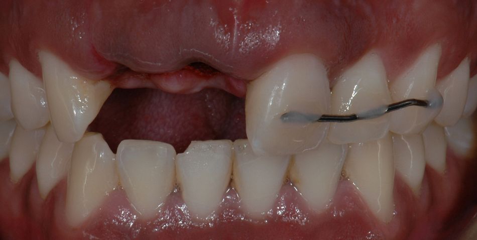 A healthy 27-year-old male suffered the avulsion of both central and lateral upper right incisors, during a street attack. At first, he attended to an emergency clinic in which the remaining teeth were splinted, and no effort was made to replace the avulsed teeth. (Fig. 1)