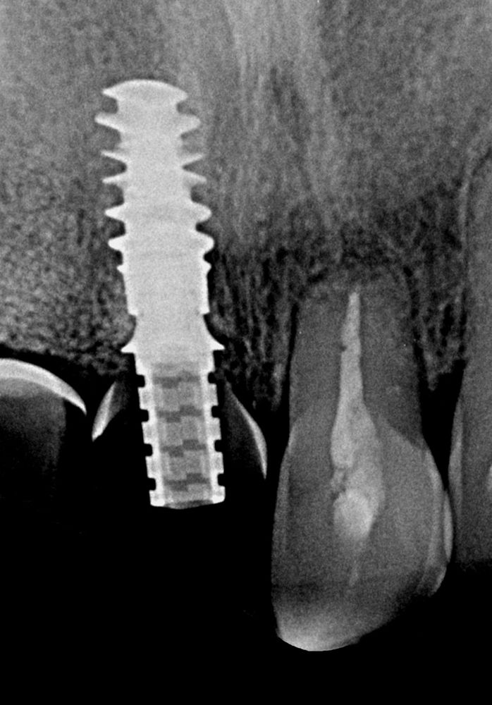 For better management of soft tissues, we decide a Type 2A, early placement and immediate restoration loading, 4 weeks after the incident.