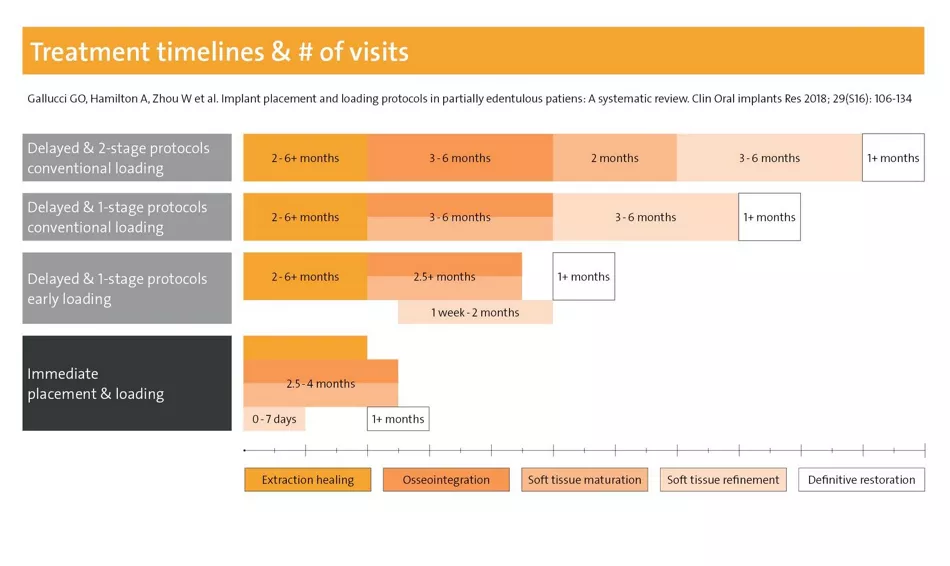 Fig. 1: Treatment duration and number of visits can be significantly reduced with immediate or early placement and restorative protocols