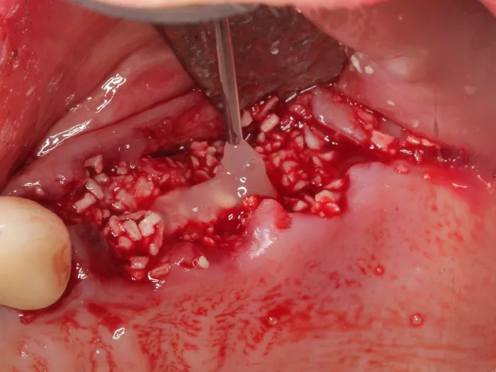 An indispensable prerequisite for the success of a therapy with Emdogain® and Emdogain® FL as with any regenerative treatment, is good preparation of the patient: the tissue structures should be healthy and free of inflammation and the patient should be able to safely apply the techniques for optimal oral hygiene. There is now enough evidence that the rate of regeneration is comparable to that of membranes - only much easier for the dentist and less expensive for the patient. Due to the different dosage units (0.15, 0.3 and 0.7 milliliters), treatment with Emdogain® can be offered much more economically than with membranes. Depending on the morphology of the defect, for example if the extent of the defect is likely to result in the prepared flap collapsing into the bony defect, Emdogain® is used in combination with bone substitute material for support. In this way, the defect can be sufficiently stabilized and the soft tissue can be kept away from the defect.9