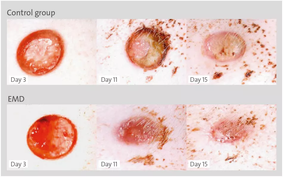 The activity of Emdogain® has been compared to that of growth factors. Studies also confirm that EMDs trigger a balanced and sequenced release of important growth factors and cytokines that orchestrate the clinical effects observed after application of Emdogain®. A common clinical observation when using Emdogain® is exceptionally fast wound healing and minimal postoperative symptoms such as pain or swelling. A number of reasons for this observation have been suggested, including anti-inflammatory and antimicrobial effects. , Inspired by clinical observations in oral surgery, several investigators have studied the effect of amelogenins on healing of both acute and chronic skin wounds. The first experimental study to demonstrate that amelogenins stimulate skin wound healing showed that the amount of granulation tissue in an EMD-treated wound was significantly increased, and that wound fill and re-epithelialization of full thickness wounds progressed almost twice as fast in the presence of EMDs. The mechanisms involved in EMD-assisted skin healing have yet to be completely understood, but it has been shown that local application of amelogenins stimulates angiogenesis by inducing secretion of vascular endothelial growth factors (VEGFs) and platelet derived growth factors (PDGFs). Similar findings have also been reported in in vitro studies, , which support the idea that amelogenins in general work by stimulating mesenchymal cells to express factors that are important for healing, growth and regeneration.