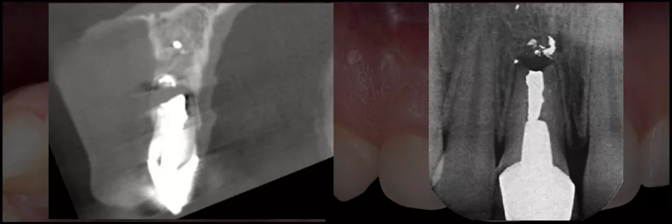 Radiographic examination, including a cross-sectional CBCT image and a periapical radiograph of the region of interest, confirmed the compromised prognosis of tooth #11, showing bone loss around the root apex and previous surgical interventions (Fig. 5).
