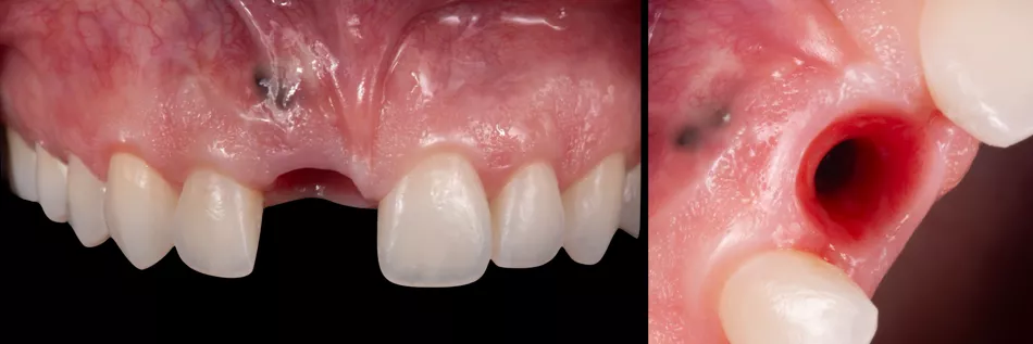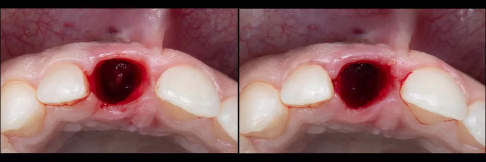 Fig 6. Occlusal view after minimally traumatic tooth extraction, before and after removal of granulomatous tissue.