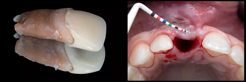 Fig 7. Extracted tooth and clinical view of the damaged socket, showing absence of buccal bone.