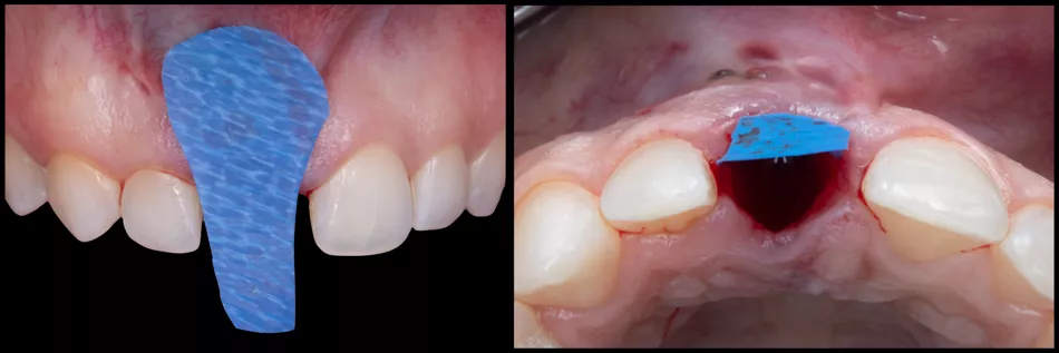 A similar small tunnel was created on the palatal side, extending approximately 3 mm. A permamem® membrane was then trimmed into a “guitar-shaped” form to adapt without wrinkling (Fig. 8).