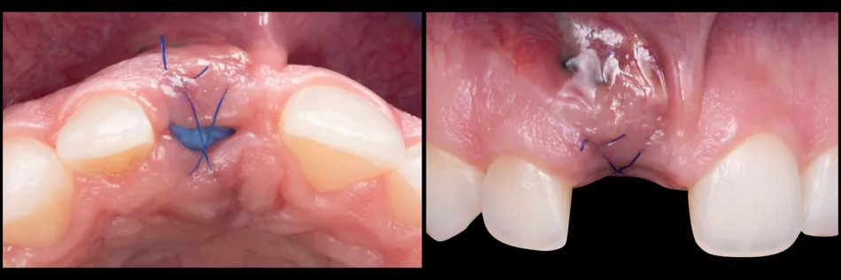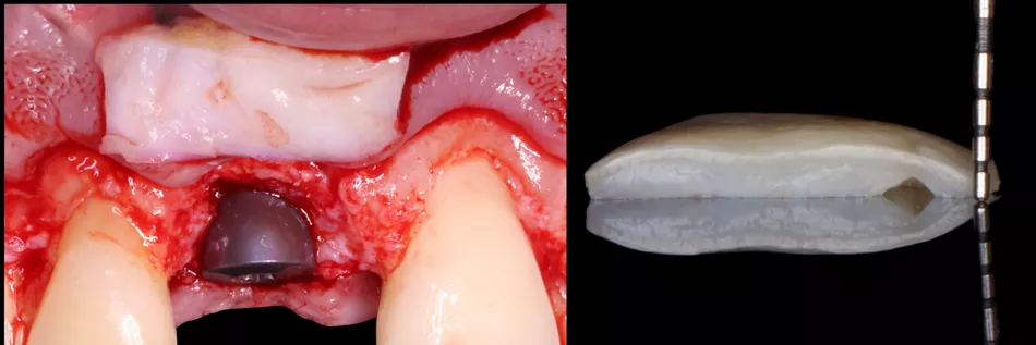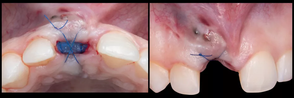 Fig 9. Placement of allograft particles (maxgraft®) filling the socket up to the alveolar crest with buccal over-augmentation. Right: membrane stabilized into the palatal mucosa.