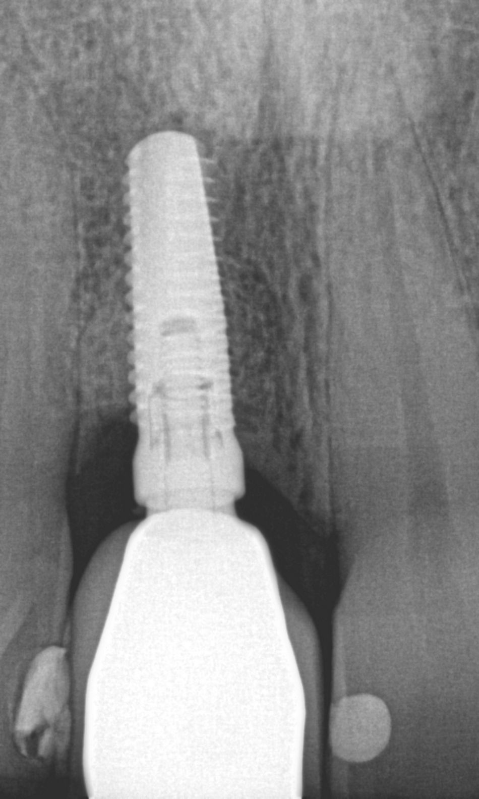 Guided bone regeneration (GBR) was successfully performed, resulting in stable bone volume around the implant site. The combination of botiss maxgraft® plus and Jason® membrane provided both osteoconductive support and a protective barrier for tissue regeneration. Additionally, the placement of a connective tissue graft enhanced soft tissue thickness, promoting improved mucogingival stability and contributing to a more favorable esthetic outcome in the anterior maxilla.