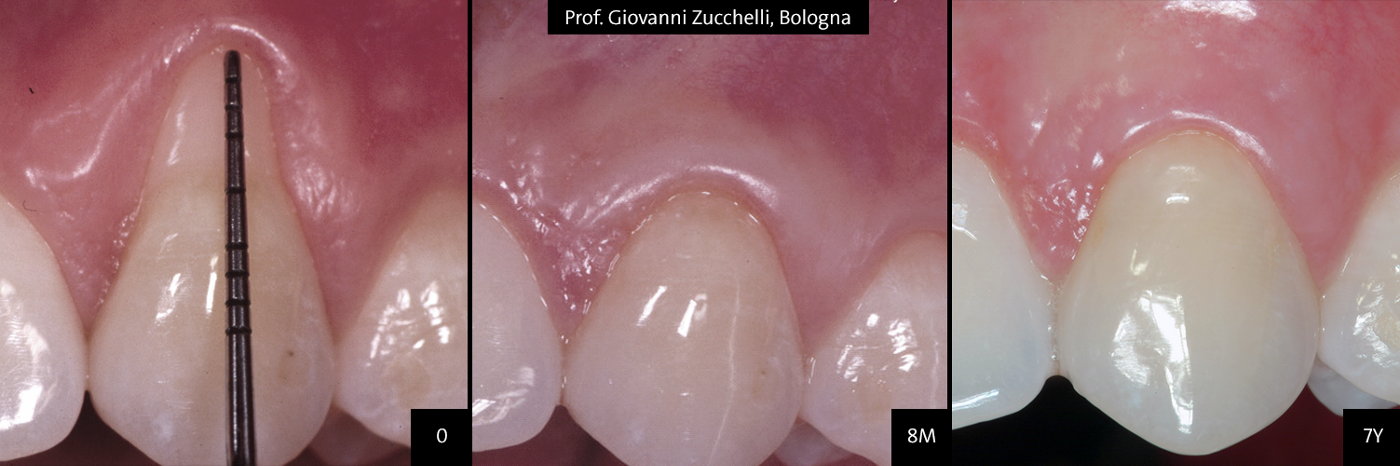 (Click on the picture for a larger resolution) Stages of treatment with Straumann® Emdogain® under a Coronally Advanced Flap (CAF): Before treatment (5 mm recession defect) – 8 months after treatment – 7 years after treatment: root is completely covered. With courtesy of Prof. Zucchelli.