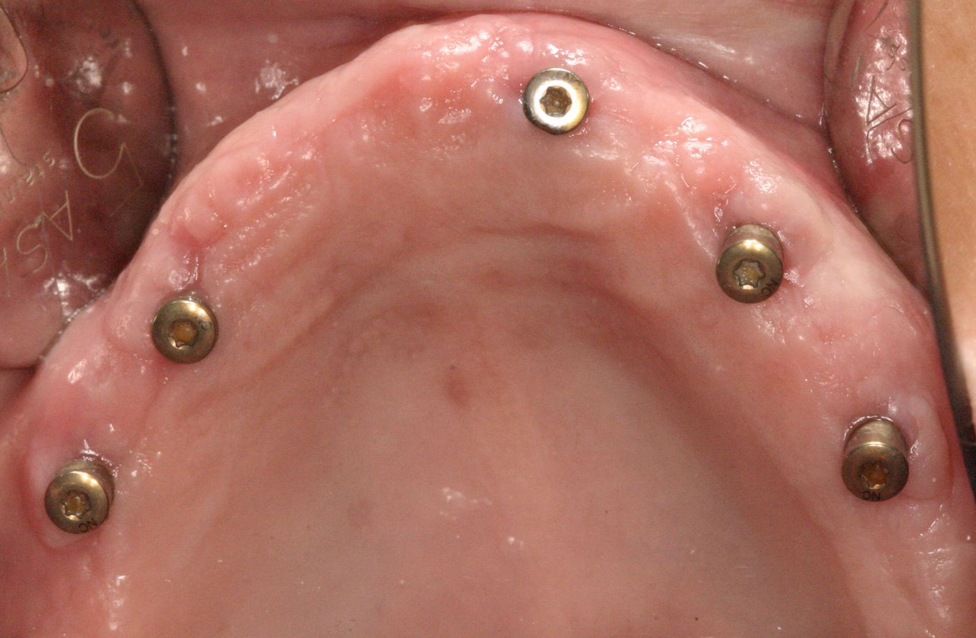 An overdenture prosthesis with retentive bar was designed by Javier Ortolá. This had three metal support points with friction retention and two metal retainers (Figs. 11, 13). This type of prosthesis provides excellent stability and never loosens, in contrast with classical bars with plastic retentions. It functions like a hybrid fixed prosthesis, with the advantage that the patient can easily remove and clean the bar and the prosthesis, which is better for the maintenance of the implants and peri-implant health.