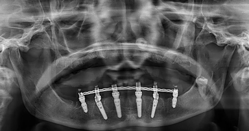 Since her oral hygiene was permanently improved, we decided to reward her by delivering a fixed prosthetic solution immediately loaded on six BLX implants.