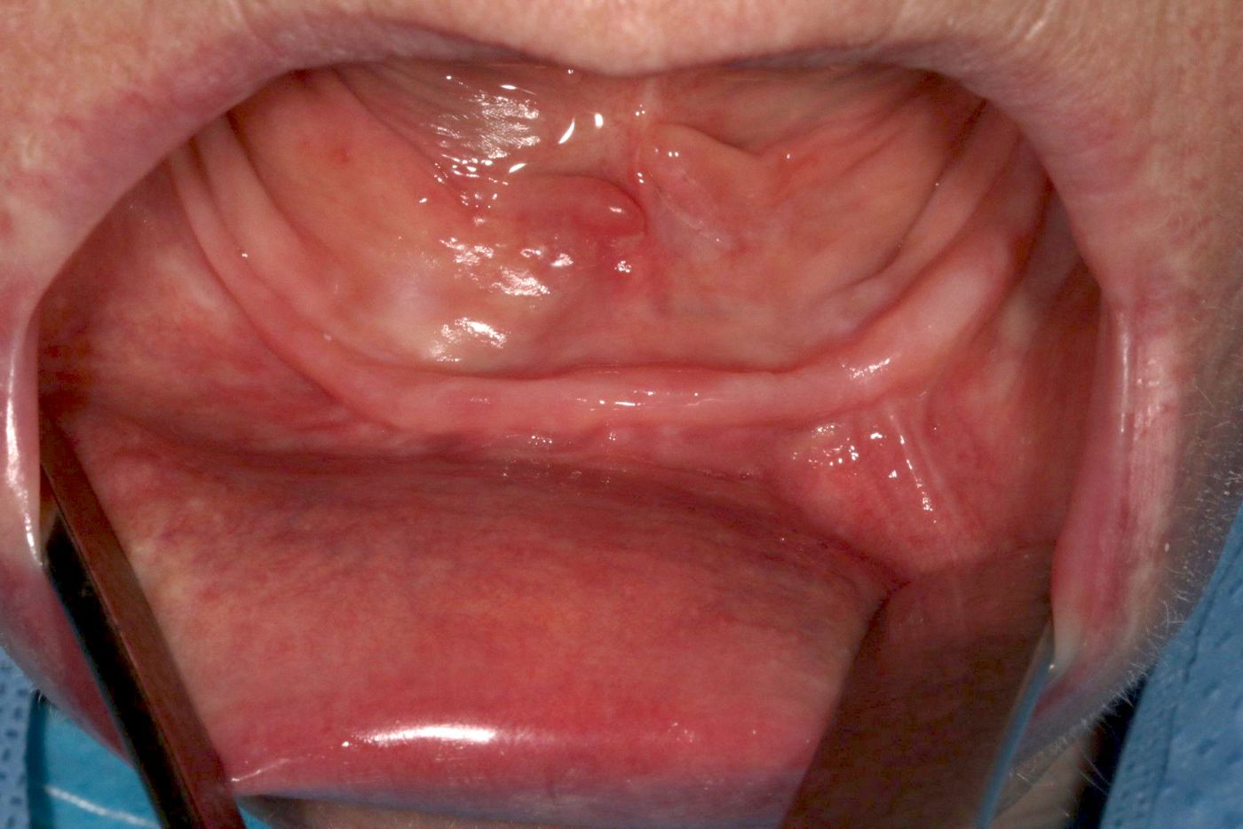 Patient, a 66-year-old lady in good health and with a thin mandibular ridge. Her main complaint was the poor retention of the prosthesis, causing her pain and discomfort when chewing properly while eating. The same retention problem would also make her very uncomfortable at social events, as she was afraid of the prosthesis slipping when she laughed.