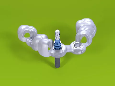 2) The transitional phase allowing for the conversion to a dental implant supported fixed hybrid prosthesis working with the Straumann Screw Retained Abutments (SRA) to account for the angled position of the dental implants. This makes the entire concept prosthetically driven right from the start.