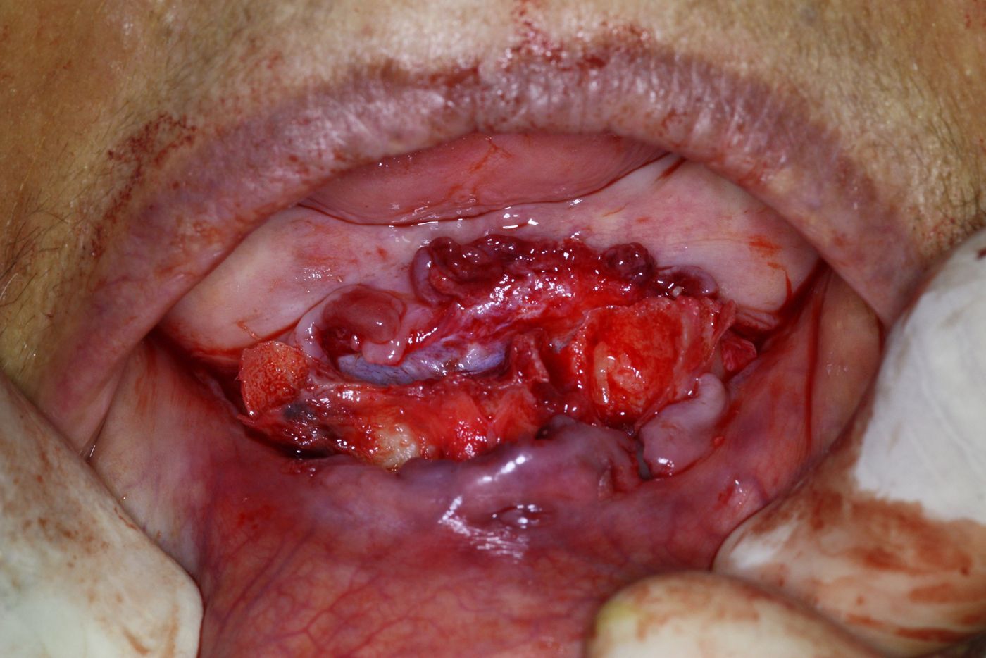 Bilateral local anaesthesia was used in the mandible for complete haemostasis during the procedure. The patient was put on an antiseptic Chlorhexidine mouthwash one week prior to the surgery and a prophylactic antibiotic Amoxycillin Clavulanic acid 625 mg BD one day prior to the surgery, which was to be continued for 5 days after the surgery.