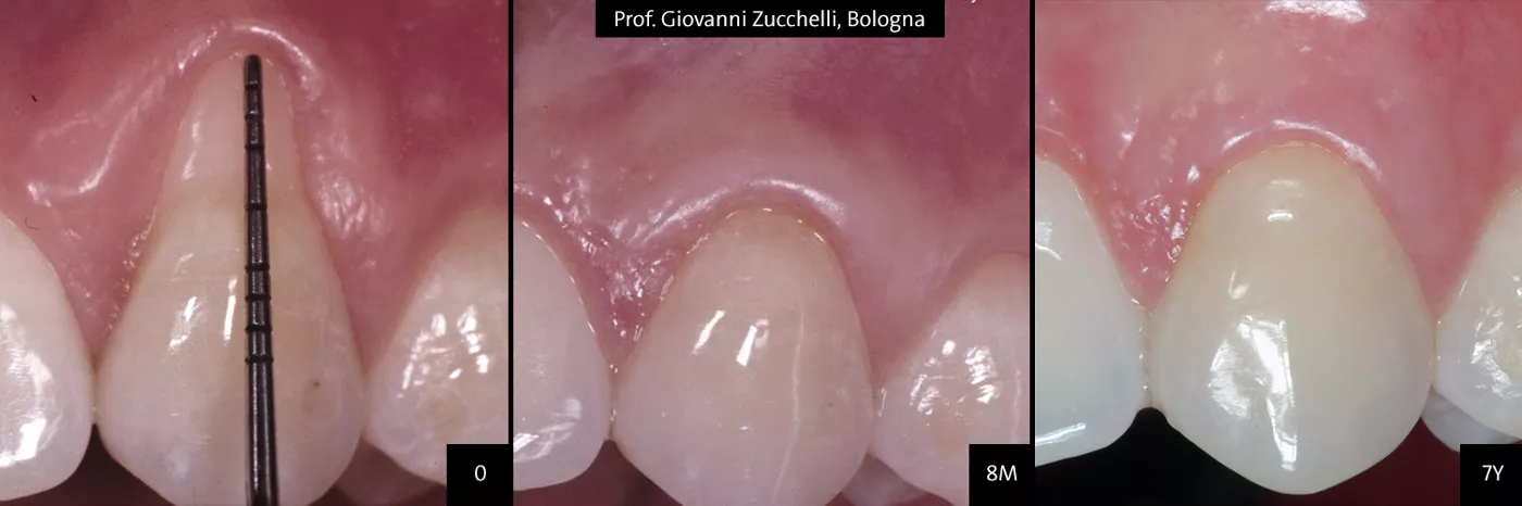 (Haga clic en la imagen para obtener una resolución más grande) Fases del tratamiento con Straumann® Emdogain® bajo un colgajo avanzado coronalmente (CAF): Antes del tratamiento (defecto de recesión de 5 mm) – 8 meses después del tratamiento – 7 años después del tratamiento: la raíz está completamente cubierta. Cortesía del Prof. Zucchelli.