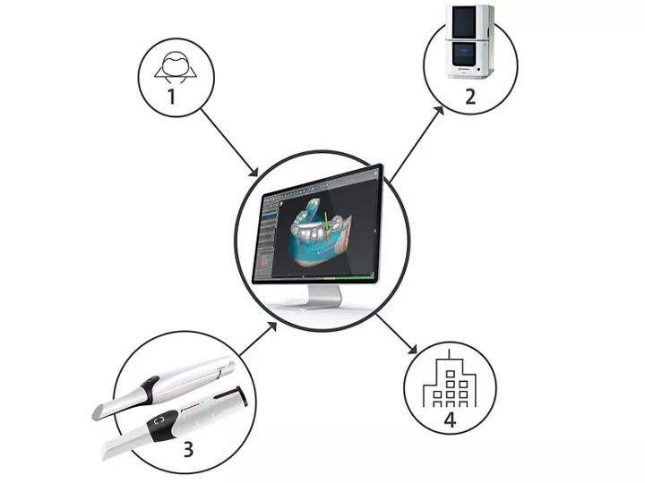 1 (CB) CT Data, 2 Local printing of guides, 3 Digital impression, 4 Connection to local lab for restorative services