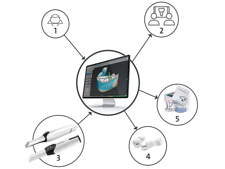 1 (CB) CT Data, 2 Connection to your partner lab, 3 Digital impression, 4 Straumann® Centralised Production, 5 Straumann® Treatment Planing Service