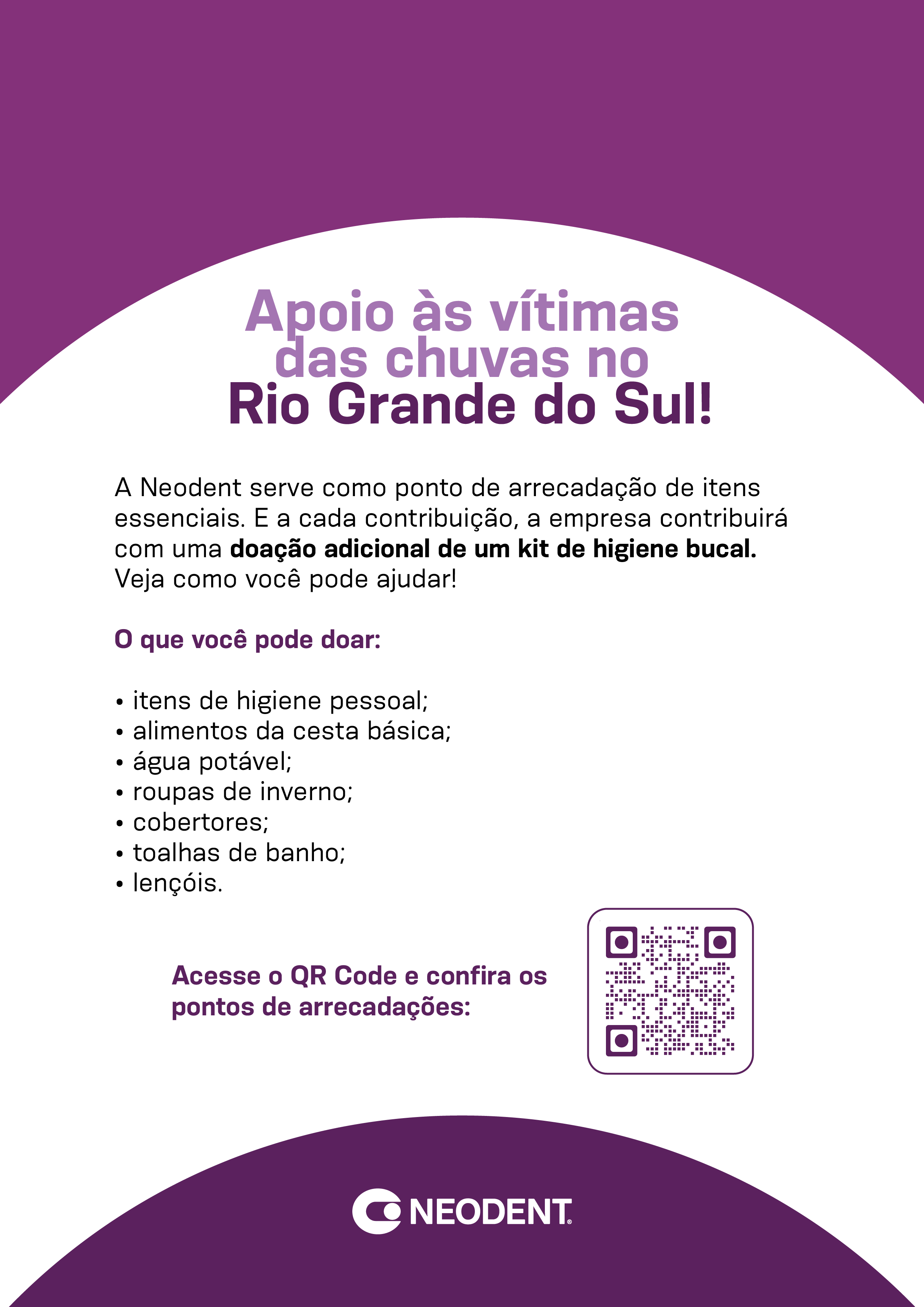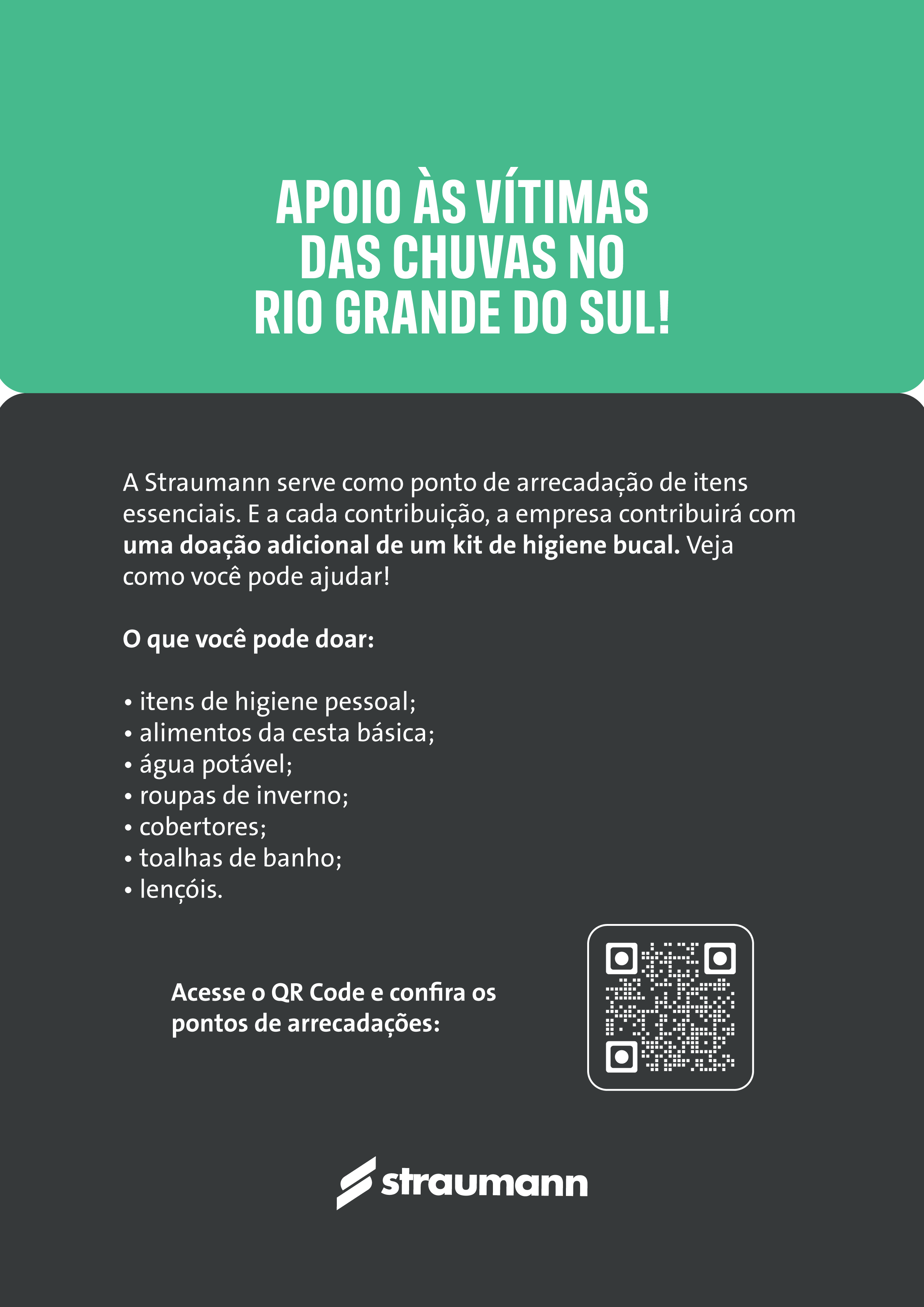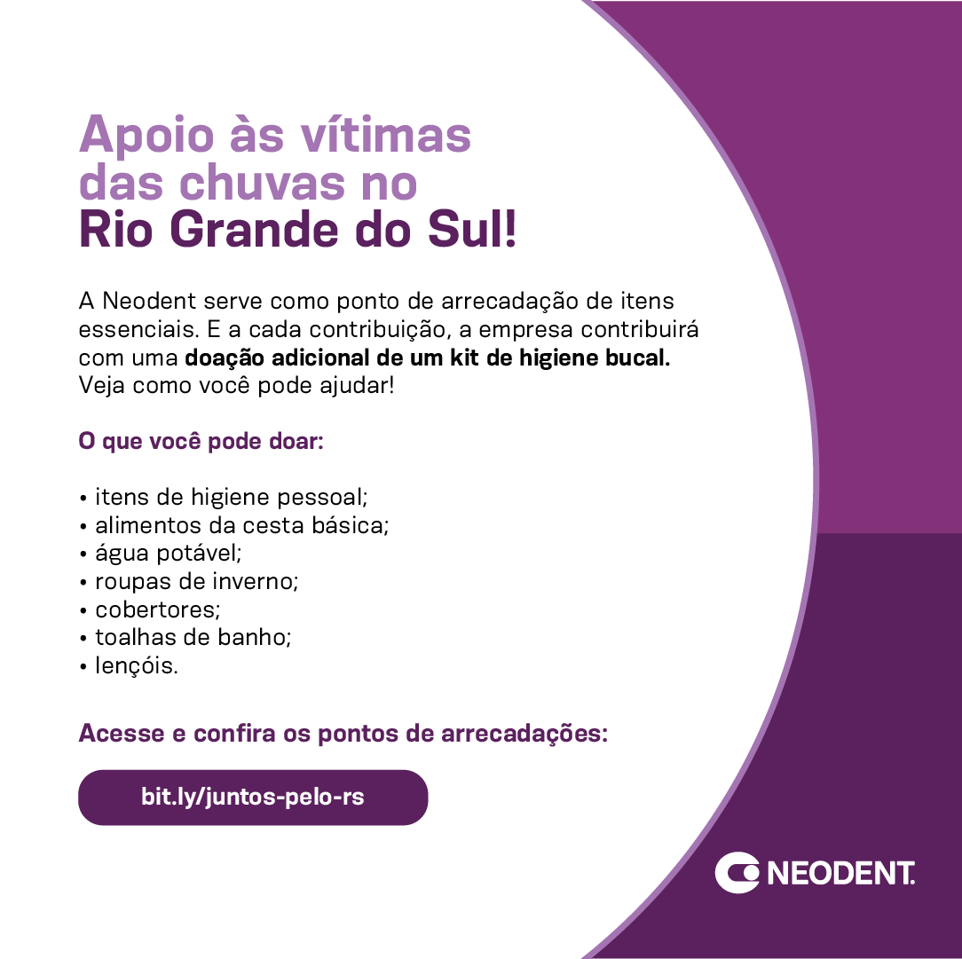 A nossa campanha de doação de itens para ajudar os desabrigados do RS, Você Doa agente dobra, foi finalizada no dia 31/Maio. Foram arrecadados um total de 23.450 itens e como contrapartida foram adquiridos 31.500 itens de higiene bucal contendo escova, pasta e fio dental. Totalizando 54.950 itens e distribuídos no RS.