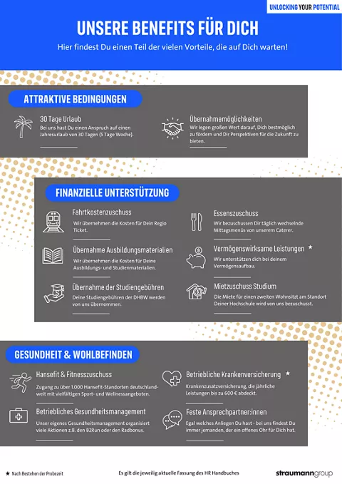 Klicke rechts auf unseren Benefits-Flyer, um Dir eine Überischt über einige unserer Sozialleistungen zu verschaffen, die wir während der Ausbildung / des Studiums anbieten.