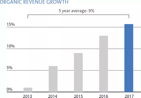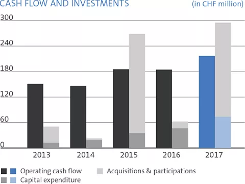 In 2017, the Group reported its strongest growth in ten years, as revenue climbed 21% in Swiss francs to CHF 1112 million. Fuelled by double-digit increases across all businesses, organic growth rose 16%, driven by North America and Asia/Pacific. Acquisitions and business combinations contributed CHF 32 million to revenue.