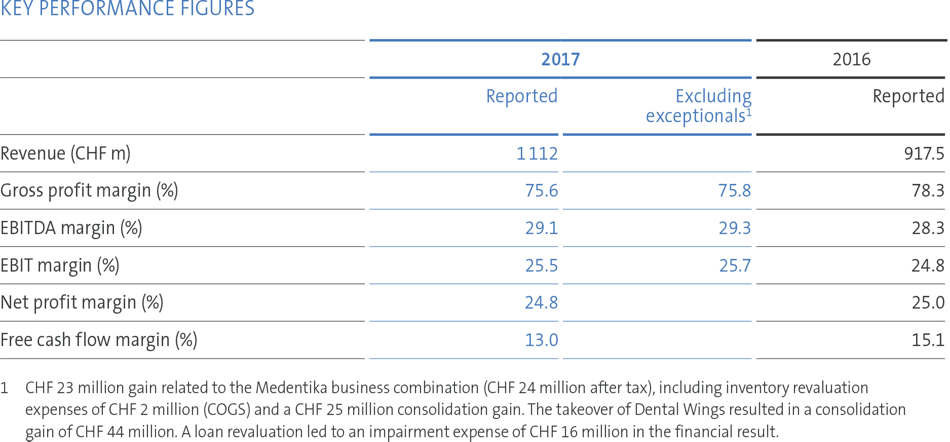 - On 1 January, we consolidated Medentika. Our 51% stake was previously reported as ‘share of results of associates’, but now contributes to the financial statements at all levels. This business combination led to several one-time effects, which include inventory revaluation expenses of CHF 2 million under ‘costs of goods sold’ and a one-time gain of CHF 25 million below the EBIT line. In connection with this transaction, we further recognized a financial liability of CHF 55 million in the balance sheet to reflect the present value of the put option granted to the founding shareholders.