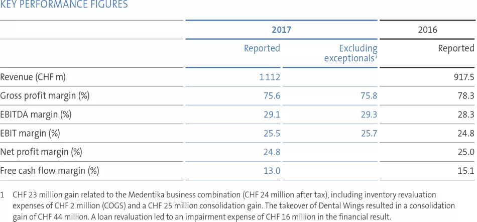 - In October 2017, we increased our stake in Dental Wings from 55% to 100% and consolidated the business. This led to a consolidation gain of CHF 44 million below the EBIT line.