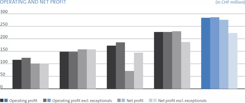 Earnings before interest, tax, depreciation and amortization (EBITDA), and exceptionals increased 25% to CHF 326 million, lifting the respective margin 170 base points to 29%.