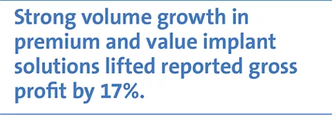 Strong volume growth in premium and value implant solutions lifted reported gross profit by 17% to CHF 841 million. Excluding the exceptional inventory-adjustment charge, underlying gross profit was CHF 842 million and the respective margin reached 76%. This is 270 basis points lower than in the prior year period, reflecting the strong demand for digital equipment, the Medentika integration costs, a higher share of third-party products, the integration of acquired businesses, and ramp-up costs in the expanded facilities.