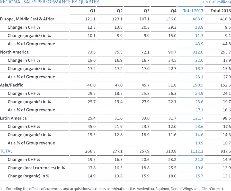 EXPANSION IN EASTERN EUROPE AND MIDDLE EAST: Growth accelerated in Eastern Europe and in the Middle East, despite socioeconomic uncertainty. The main drivers were Russia, where we invested in additional staff and sales offices, as well as Iran, where we took over distribution, and in Turkey, where we launched Medentika. In the latter two alone, more than 600 000 implants are placed annually, which offers us a considerable opportunity. We also announced agreements to acquire Same Day Solutions (SDS), a dental distribution company in Portugal, and our distributor in South Africa, and will close both deals early in 2018.