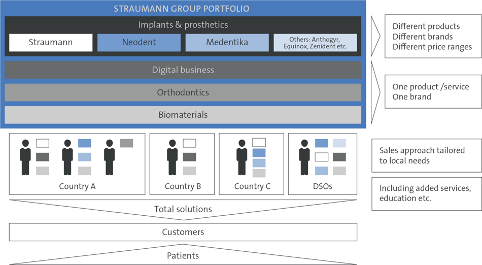 The new Straumann Group structure (outlined on the left) enables us to provide comprehensive solutions that include a range of implant and prosthetic systems - covering all price requirements, CADCAM prosthetics, digital equipment and workflows, biomaterials, orthodontic treatments and various services e.g. training and education. The portfolio mix, strategy and sales team approach is tailored for local markets by the Regions with the goal of balancing the premium and non-premium business to gain maximum market share.