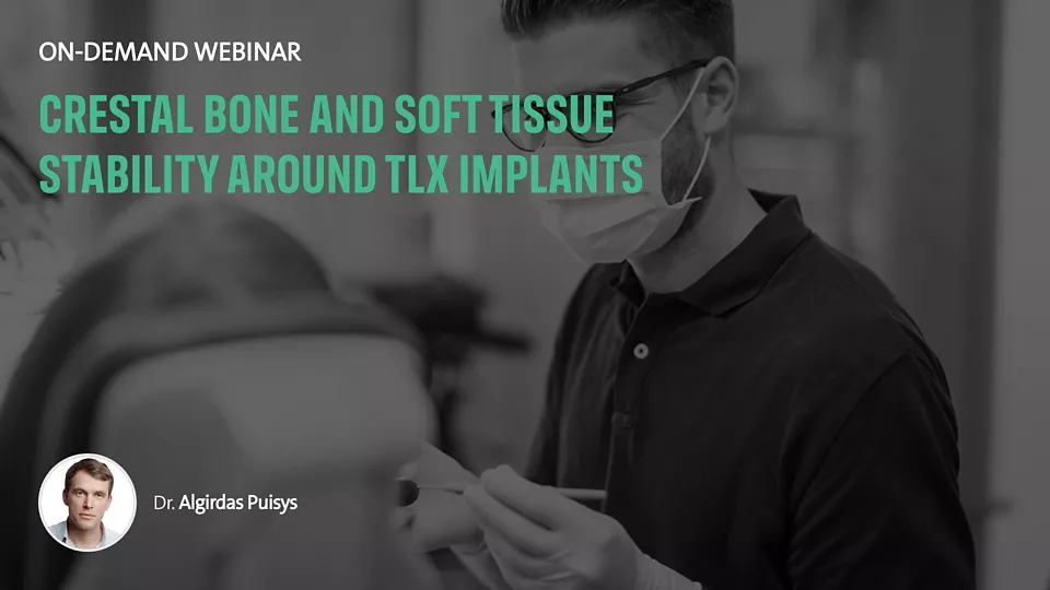 In his webinar, Dr. Algirdas Puisys will elaborate on the importance of peri-implant soft tissue conditions on long-term peri-implant crestal bone stability as a critical factor for long-term peri-implant health and success. He will specifically present the different clinical strategies for increasing implant soft tissue thickness depending on the anatomic local crestal bone and soft tissue anatomic preconditions of the implantation site. Dr. Puisys will also illustrate how tissue-level implants and specifically novel TLX implants may be used in this approach and explain how these implants can effectively support the concept. Finally, this webinar will highlight the unique features of novel TLX implants and how they may be used as part of different indications ranging from treatments in the molar to premolar and frontal aesthetic areas in achieving long-term successful treatment outcomes. Learning objectives Understand the importance of peri-implant soft tissue conditions, thickness for long-term stable peri-implant crestal bone levels, implant health, and success Learn the different indication-specific treatment strategies and approaches on how to improve and optimise peri-implant soft tissue thickness Recapitulate the unique design features of tissue-level implants to support long-term crestal bone stability and implant health Understand the unique features of TLX implants for achieving primary stability and optimal soft tissue characteristics for long-term peri-implant health and crestal bone stability
