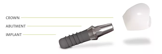 Permanent dental implants consist of a small post, usually made of titanium, and similar in shape to screws. Under local anesthetic, they are surgically inserted into the jawbone, and serve as the first step in the process to replace missing teeth. Once inserted, the dental implant bonds with the natural bone, acts as a substitute for the root of the tooth, and provides the base of support for the one or more replacement teeth, also known as the crowns.