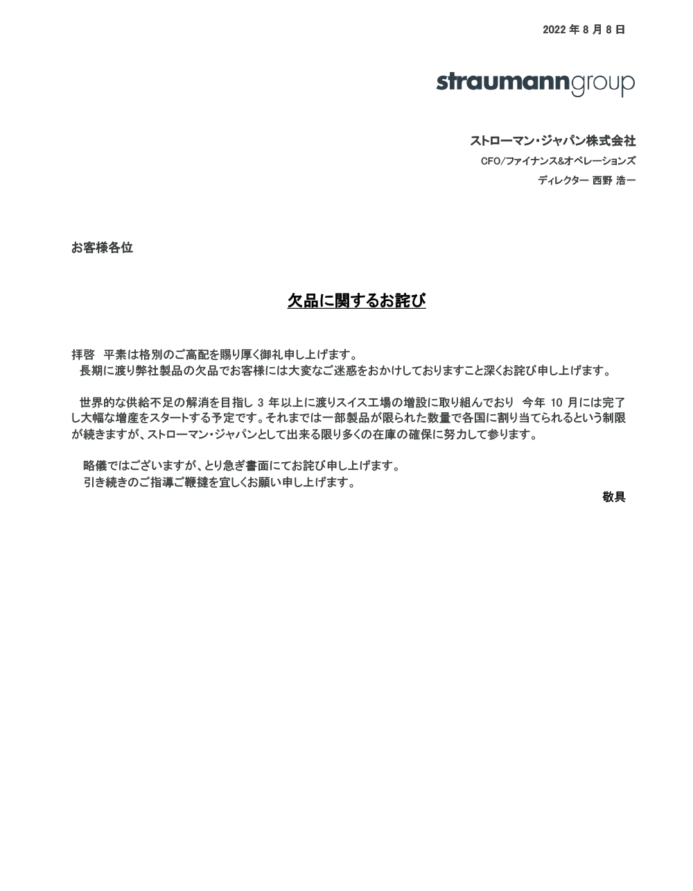 停止 CARES製品、3Dガイド オーダー受領メールサービス