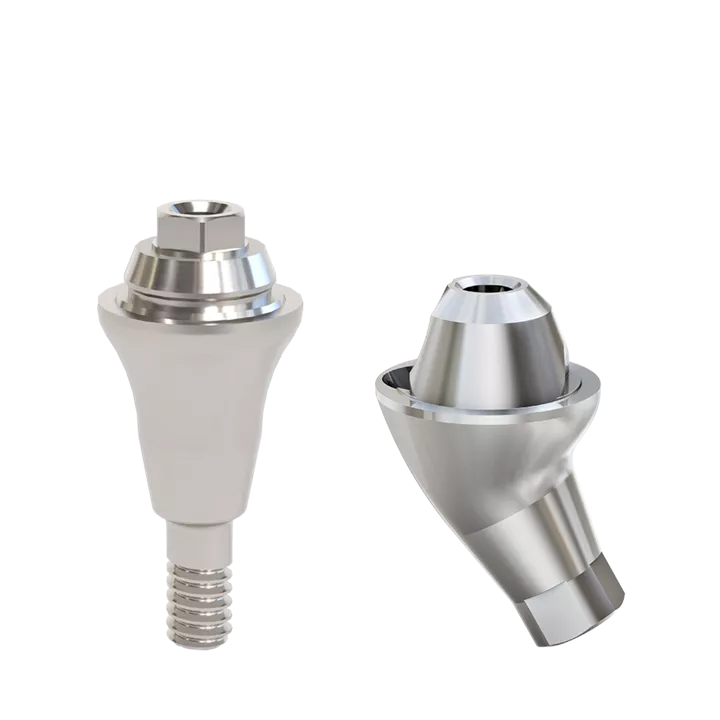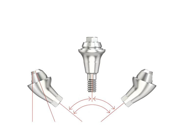 The Multi-unit abutments offer a standardized platform for prosthetic components, featuring a 21° taper on one side. When utilizing the 30° angled abutments, they can compensate divergences of up to 102° between implants.