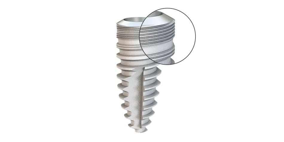 The crestal micro-thread promotes the permanent apposition of bone cells and their retention in the crestal region. With subcrestal insertion, in combination with the high precision conical inner connection, it produces apposition of the bone past the shoulder to the interface.