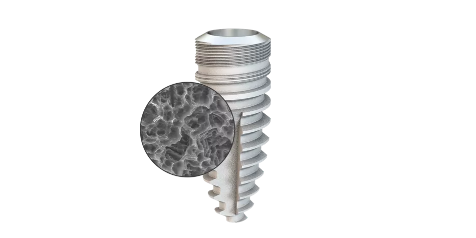 The highly pure, sand-blasted and acid-etched surface extends the entire length of the implant to the implant shoulder. It has ideally dimensioned micro-macro roughness to allow the apposition of bone-forming cells, thus promoting optimum and particularly reliable long-term osseointegration of the implant. In combination with the coronal micro-grooves and conical interface it ensures exceptional crestal bone formation, past the implant shoulder to the interface.