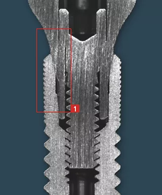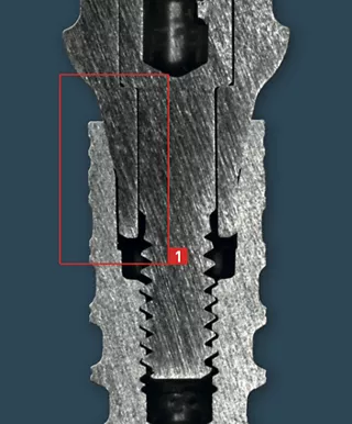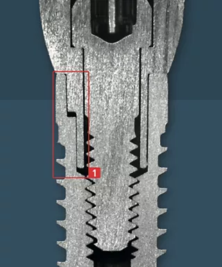 | 1 | Reduced gap dimensions (see horizontal section below) on the preliminary cylindrical segments ensure reduced relative movements between the implant and abutment. This reduces the stress on the abutment screw and "micro-pump effect" of the system. |