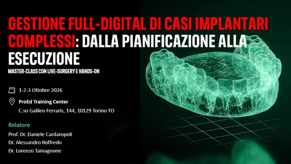 Questo corso propone un approccio completo e moderno all’implantologia orale digitale, guidando ilpartecipante lungo tutto il percorso clinico, dalla fase diagnostica alla riabilitazione protesica. AttraversoCBCT e scansioni intraorali si imparano a raccogliere e integrare correttamente i dati anatomici del paziente,mentre software dedicati come SmileCloud e CoDiagnostix supportano la pianificazione implantare in modopreciso e protesicamente guidato. Vengono approfondite la scelta di impianti e componenti, la progettazionedelle dime chirurgiche e la stampa 3D in-office, con un focus su protocolli di carico immediato. Casi clinici edesercitazioni pratiche rendono l’esperienza concreta e immediatamente applicabile nella pratica quotidiana.