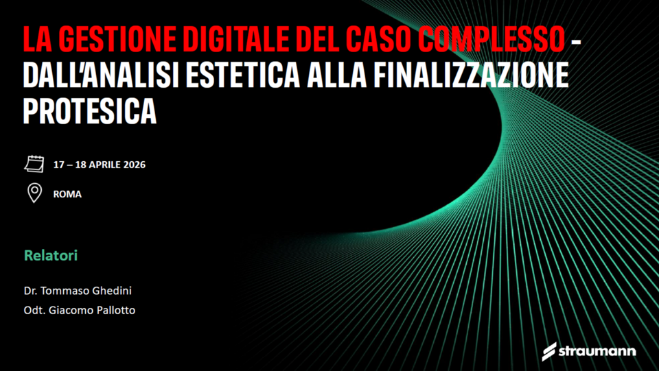 Il modulo avanzato “La gestione digitale del caso complesso” è un percorso formativo intensivo di due giornate dedicato alla pianificazione e alla gestione completa dei casi implanto-protesici complessi, con particolare attenzione all’estetica, ai protocolli di carico immediato e all’integrazione tra clinico e laboratorio. Il corso guida il partecipante dall’analisi estetica iniziale fino alla finalizzazione protesica, all’interno di un workflow digitale strutturato e condiviso. Il programma approfondisce l’utilizzo di Smile Cloud come strumento di comunicazione evoluta e di pianificazione estetica, includendo la ceratura digitale attraverso 3DNA, e affronta i protocolli di Immediacy con focus su profili di emergenza e scelta dei materiali. Ampio spazio è dedicato alla pratica, con sessioni hands-on in cui ogni partecipante programmerà casi complessi su Smile Cloud e affronterà la pianificazione digitale di riabilitazioni full arch mediante CoDiagnostix. Il corso è rivolto a clinici che desiderano perfezionare le proprie competenze nel workflow digitale avanzato, migliorando la predicibilità clinica ed estetica nei casi complessi e integrando in modo efficace la pianificazione digitale nella pratica quotidiana