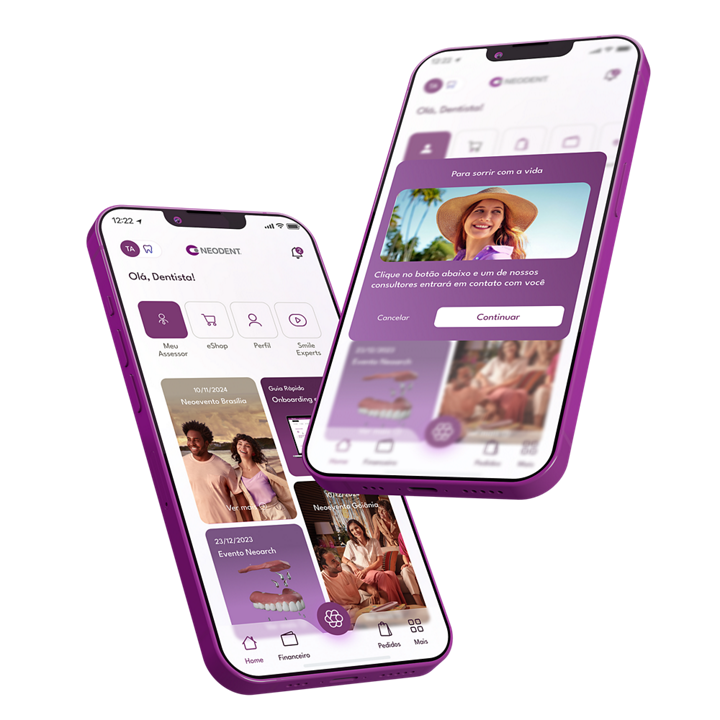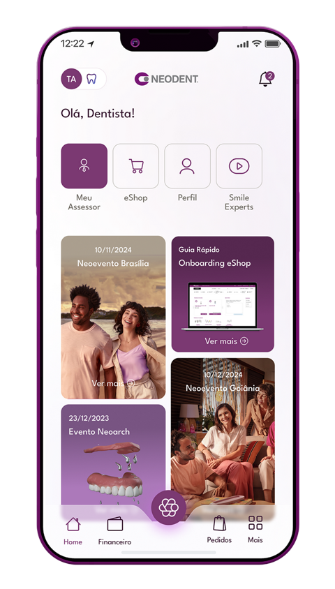 O aplicativo Neodent oferece funcionalidades para facilitar transações financeiras, rastrear pedidos e otimizar o fluxo de trabalho no consultório. Ele permite gerenciar pagamentos, acompanhar pedidos e conectar-se com a comunidade de profissionais.