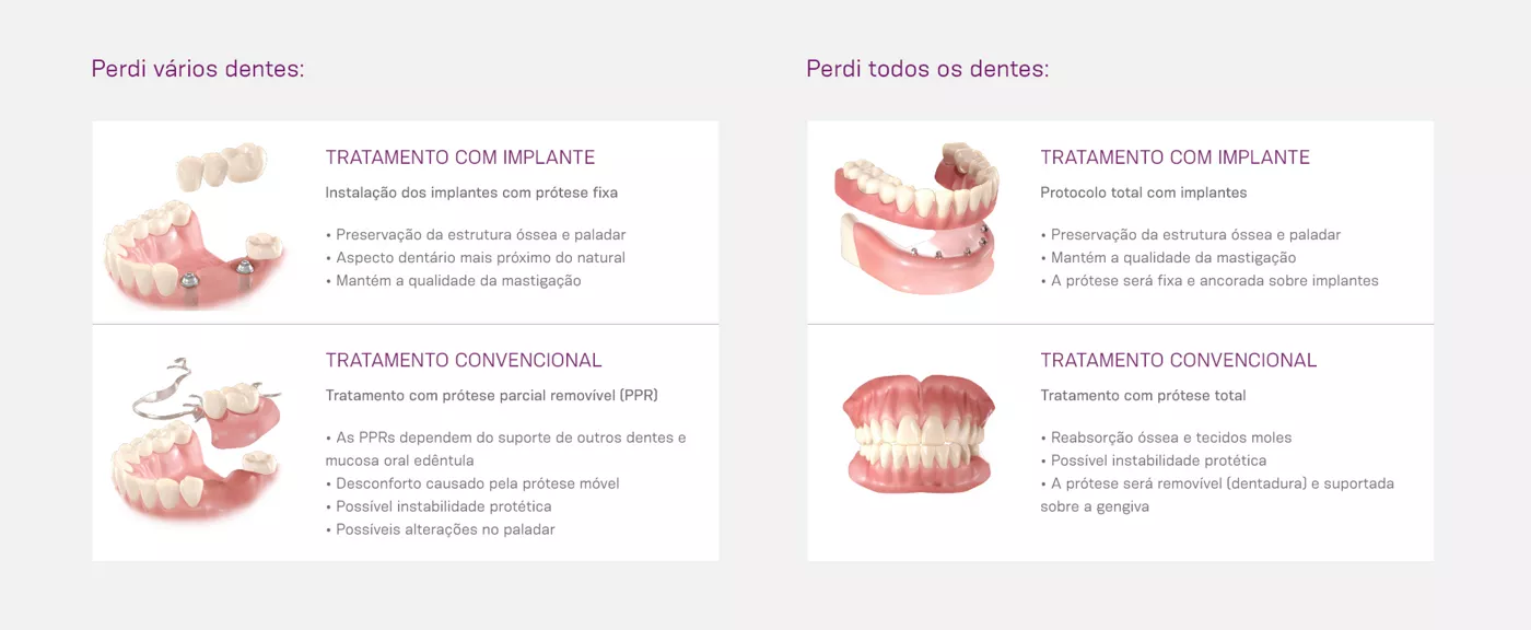 Há vários tipos de tratamento para restauração ou substituição dentária, a escolha varia de acordo com o caso clínico. É possivel ter como indicação apenas um ou todos os tratamentos disponíveis. Para definir seu plano de tratamento, consulte seu cirurgião-dentista ou encontre um mais próximo de você clicando aqui.