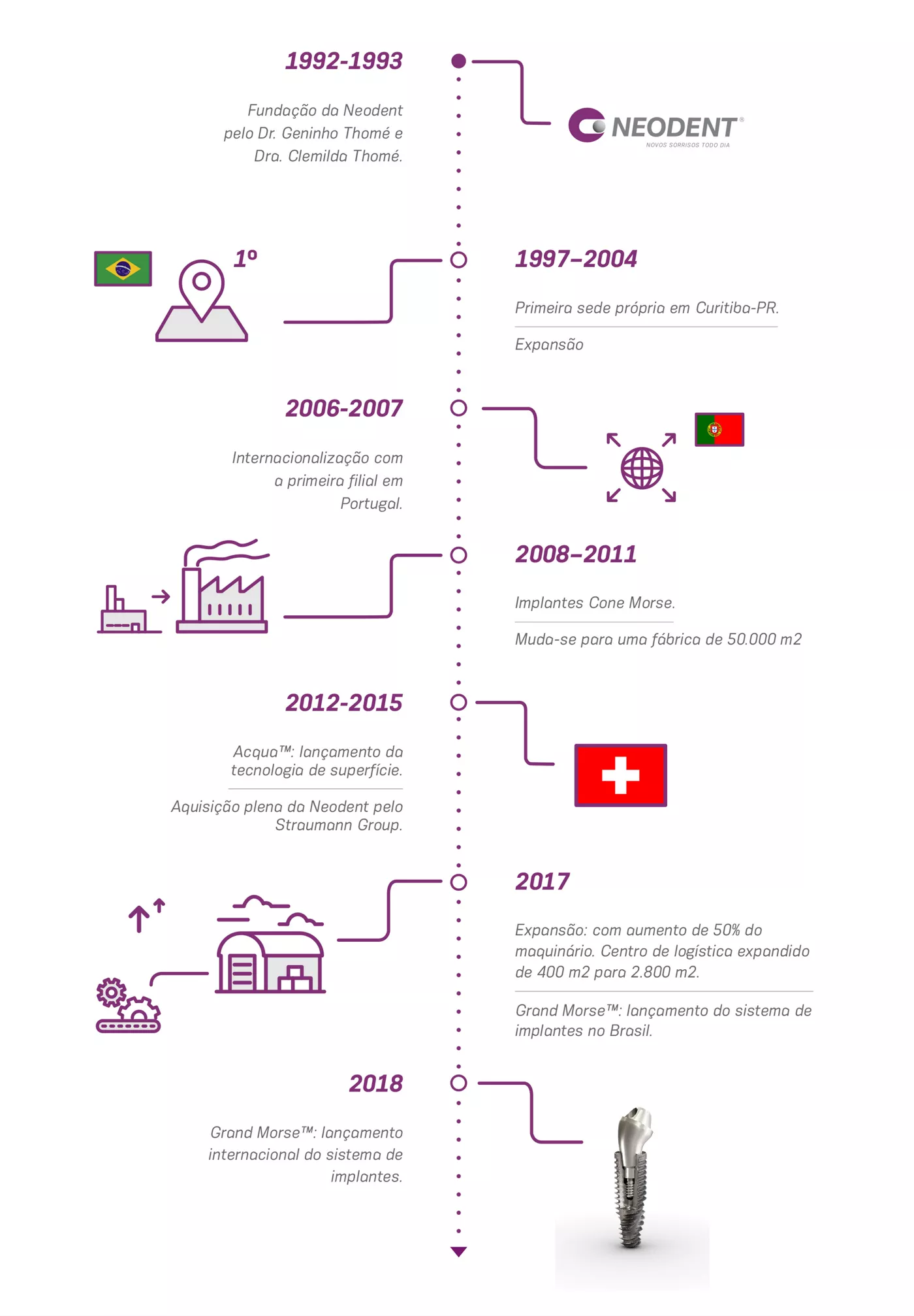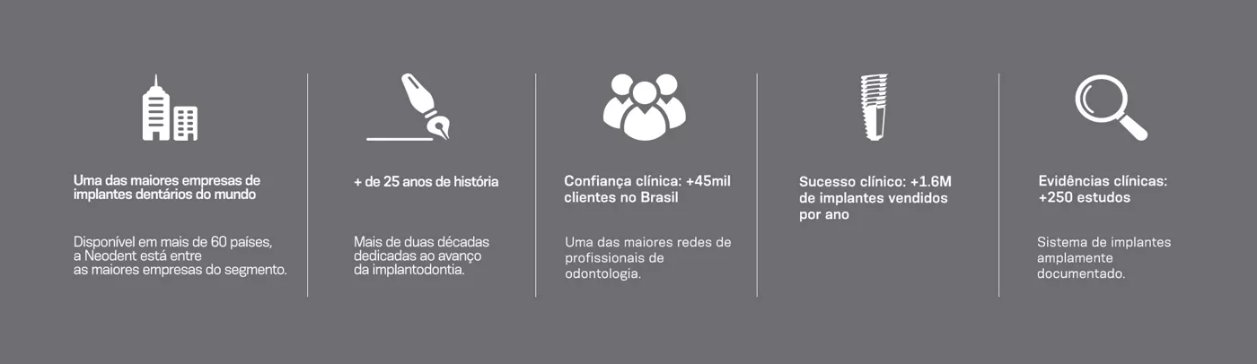 Fundada por um dentista para dentistas, há mais de 25 anos, a Neodent é a empresa líder em implantes no Brasil, onde vende mais de um milhão e meio de implantes anualmente. A Neodent está entre os três principais fornecedores de implantes do mundo e suas soluções estão disponíveis em mais de 60 países. Os Sistemas de Implantes Dentários Neodent são focados nos conceitos de tratamentos progressivos, como a carga imediata, com soluções modernas e confiáveis que tornam a terapia acessível, inclusive, economicamente. Com sede em Curitiba, no Brasil, a Neodent é uma empresa do Grupo Straumann, líder global em soluções odontológicas que restauram sorrisos e confiança.