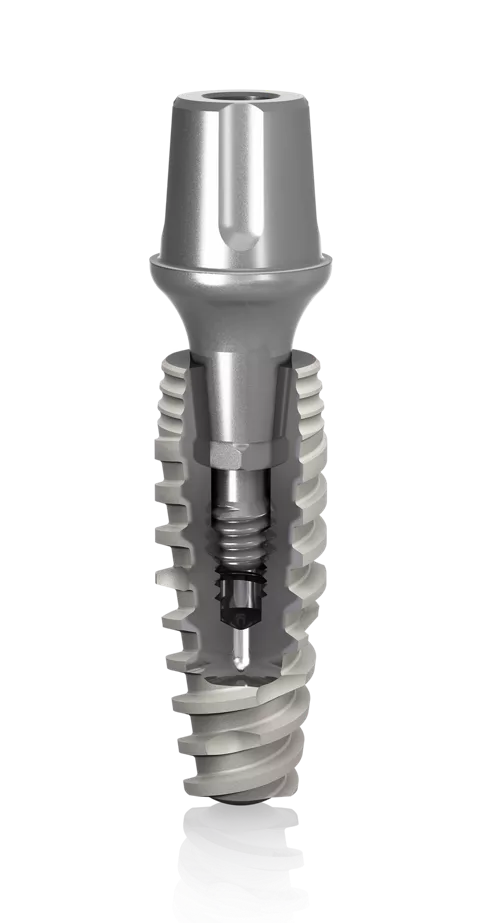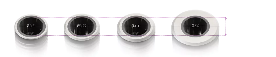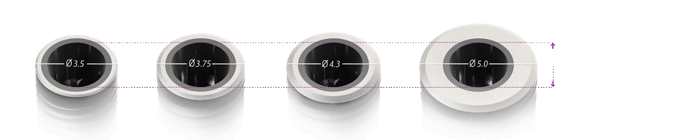 - Adaptação protética única que oferece extrema flexibilidade na seleção de intermediários retos, angulados, parafusados ou cimentados, independentemente do diâmetro do implante.
