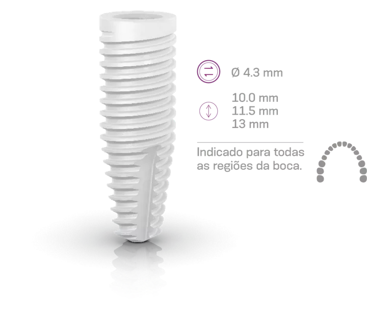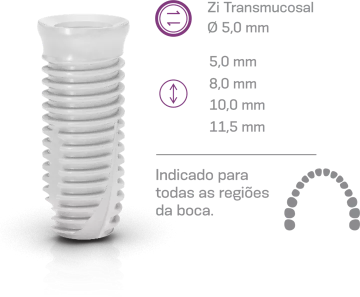 O implante Neodent® Zi Transmucoso Ø5.0 foi projetado para fornecer uma solução cerâmica otimizada para a região posterior, com foco em proporcionar robustez e confiabilidade sob altas cargas oclusais. Além disso, as versões de comprimento mais curto permitem reabilitação em casos com posicionamento complexo do implante, como atrofia óssea vertical ou alvéolos maiores.
