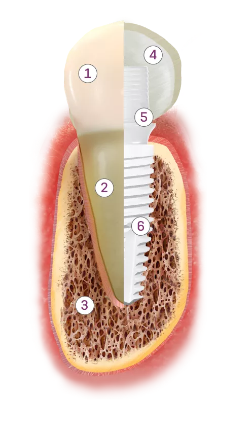 Ci-dessous, vous pouvez voir la structure d'une dent naturelle comparée à celle d'un implant et d'une prothèse :